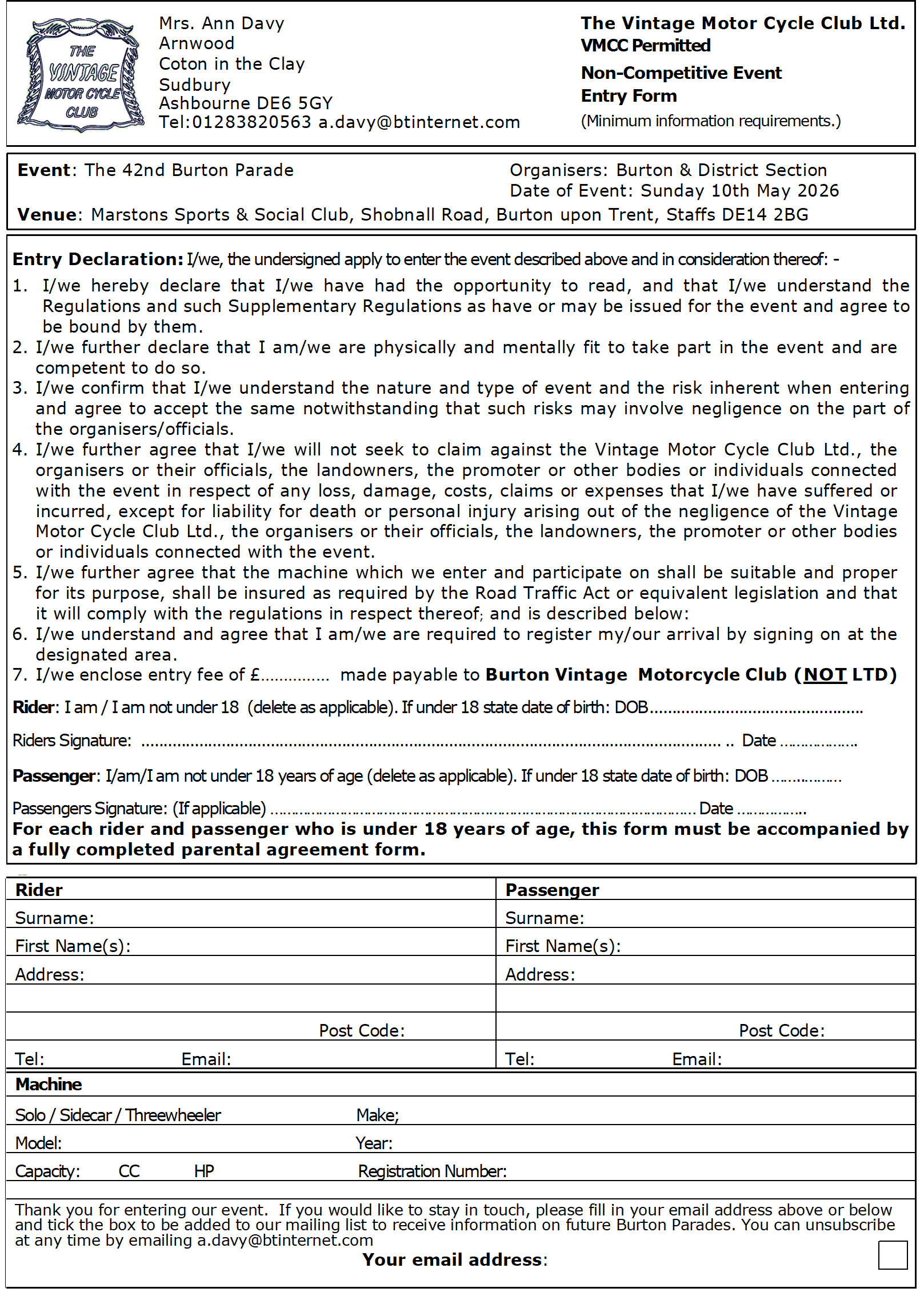 ENTRY SECRETARY Mrs Ann Davy, Arnwood, Coton in the Clay, Sudbury, Ashbourne DE6 5GY